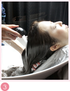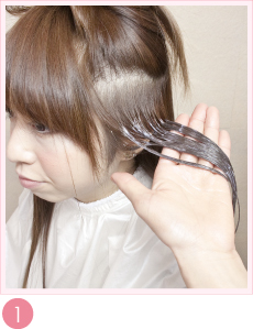 根元はペタっとしないように、クリームは少し根元と間をあけてぬり、ハチ上にはコットンをしいてぬっていきます。
