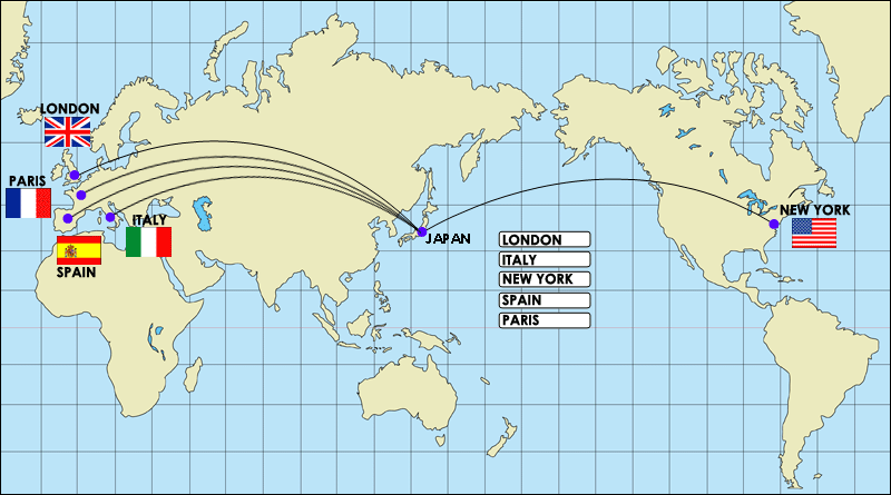 マップ上の国旗や中央の都市名をクリックしてください。詳細画面が表示されます。